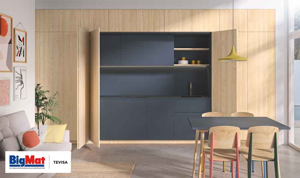 Si lo que buscas es una línea neutra, las cocinas en armario resultan idóneas para crear espacios multifuncionales (teletrabajo, cocina unida al salón, etc).